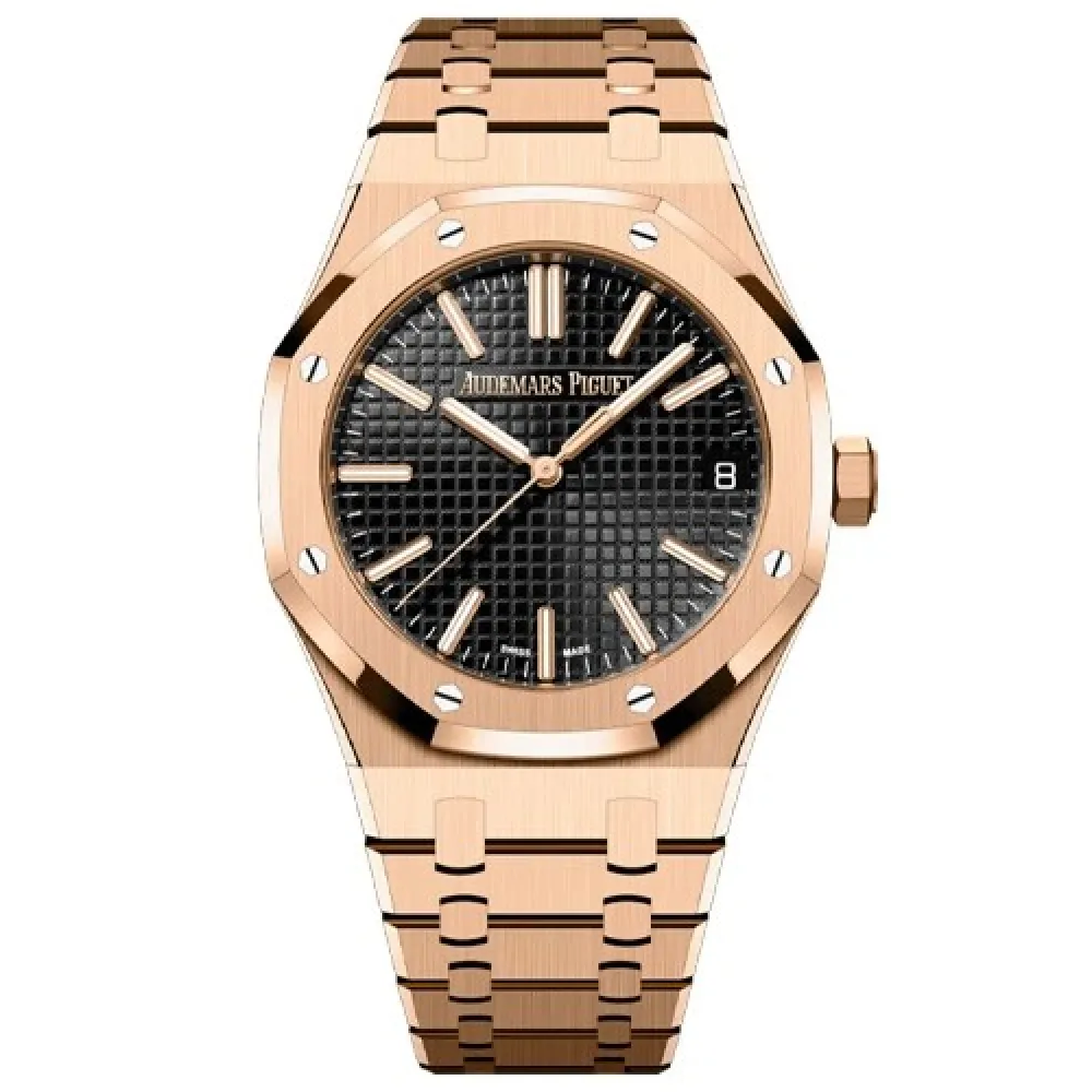 Дизайн часов Royal Oak отличается характерным восьмиугольным безелем с видимыми винтами, что придает им уникальный и узнаваемый облик. Циферблат выполнен в фирменном стиле “Grande Tapisserie” с изысканным узором, который подчеркивает внимание к деталям. Индексы и стрелки из розового золота с люминесцентным покрытием обеспечивают отличную читаемость в любых условиях освещения.